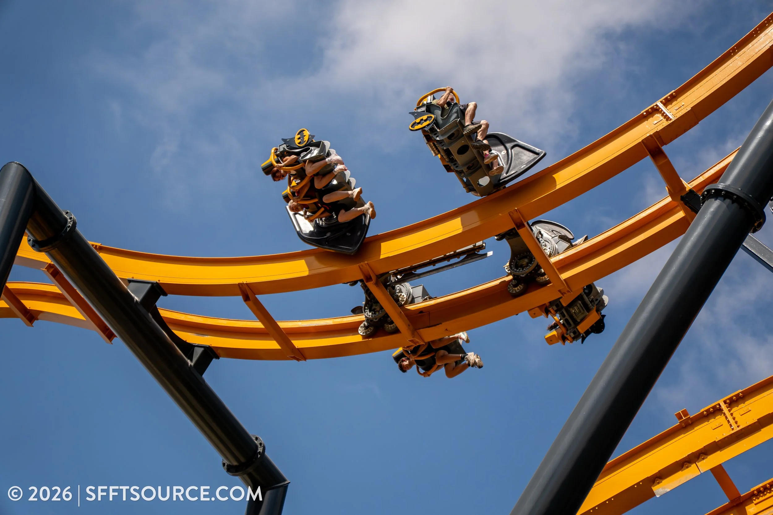 Previous “4D” roller coaster concepts featured mechanisms that controlled the ride’s inversions. X2 at Magic Mountain, for instance, features a second set of rails intended to exclusively determine the orientation of ride cars. S&S 4D roller coasters are mostly aided by gravity and weight distribution. Though ride car orientation is controlled in the station, the only other mechanism to aid flipping are magnetic fins throughout the track layout. The rest of the ride experience depends on how the riders themselves are placed, guaranteeing that no two rides on Batman: The Ride are the same.